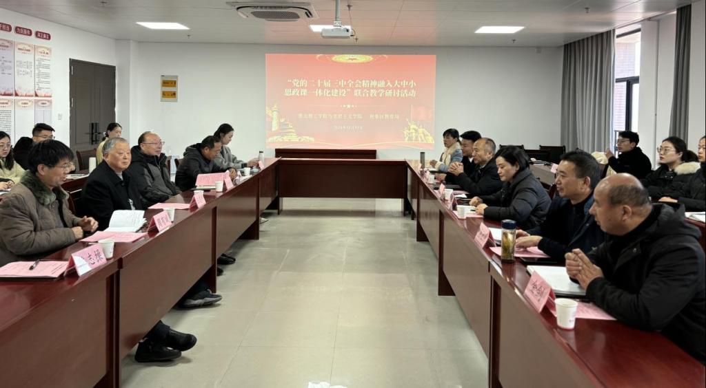 为贯彻落实党的二十届三中全会精神“三进”工作,推进大中小学思政课一体化建设走深走实,12月17日,永利集团304am登录与杜集区教育局联合举行结对共建“大中小思政课一体化共同体”开展“党的二十届三中全会精神融入思政课”集体备课会。永利集团304am登录党委副书记、纪委书记、副校长汪建利,淮北市杜集区委常委、宣传部部长蒋影,杜集区教育局三级调研员曹立民,永利集团304am登录党建办负责人、永利集团304am登录全体教师、杜集区思政教研员与中小学思政课名师工作室全体成员参加此次活动。活动由永利集团304am登录院长主持。